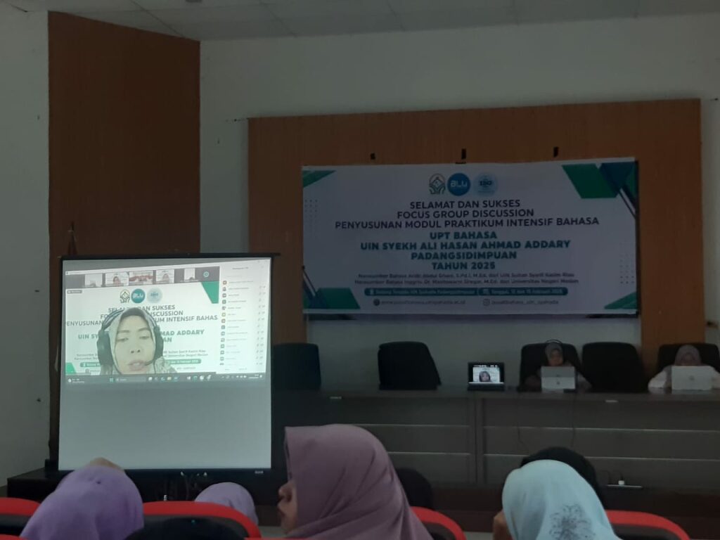 Focus Group Discussion (FGD) Penyusunan Modul Praktikum Intensif Bahasa sukses diselenggarakan oleh UPT. Bahasa Universitas Islam Negeri (UIN) Syekh Ali Hasan Ahmad Addary Padangsidimpuan pada Selasa, 12 Agustus 2025 bertempat di Gedung Terpadu UIN Syahada Padangsidimpuan. Kegiatan ini dihadiri oleh para akademisi, dosen, serta pakar bahasa, dengan menghadirkan dua narasumber utama: Dr. Masitowarni Siregar, M.Ed. (pakar Bahasa Inggris) dan Abdul Ghani, S.Pd.I., M.Ed. (pakar Bahasa Arab).