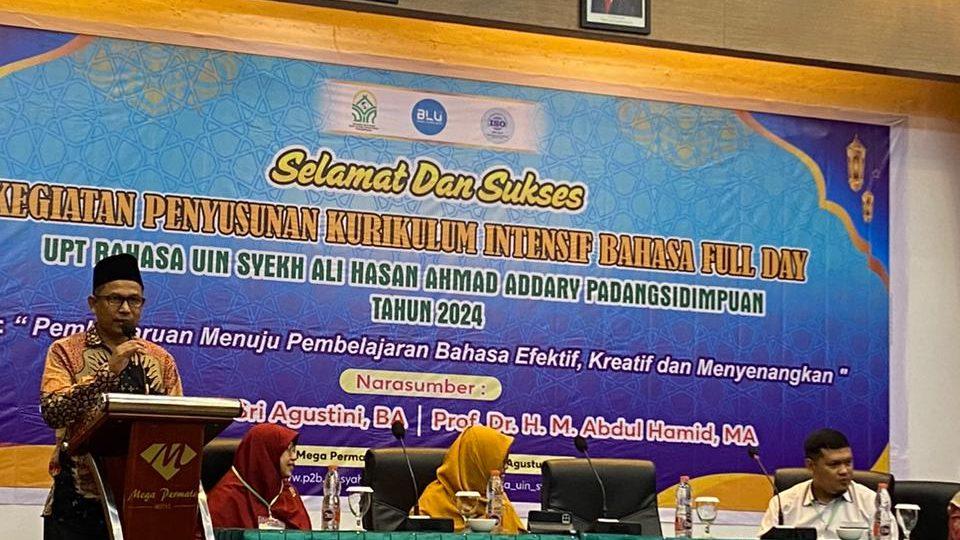 Padangsidimpuan, 6 Agustus 2024 – UPT Bahasa melaksanakan kegiatan di Hotel Mega Permata dalam pembukaan kegiatan penyusunan kurikulum intensif bahasa full day yang diadakan hari ini dengan tema “Pembaharuan Menuju Pembelajaran Bahasa Efektif, Kreatif, dan Menyenangkan.” Acara ini resmi dibuka oleh Wakil Rektor Bidang Akademik dan Pengembangan Lembaga UIN Syahada, Bapak Dr. Erawadi, M.Ag., yang dalam sambutannya menekankan esensi kurikulum dalam proses pembelajaran Intensif Bahasa dengan memasukkan Teoantropoekosentris.